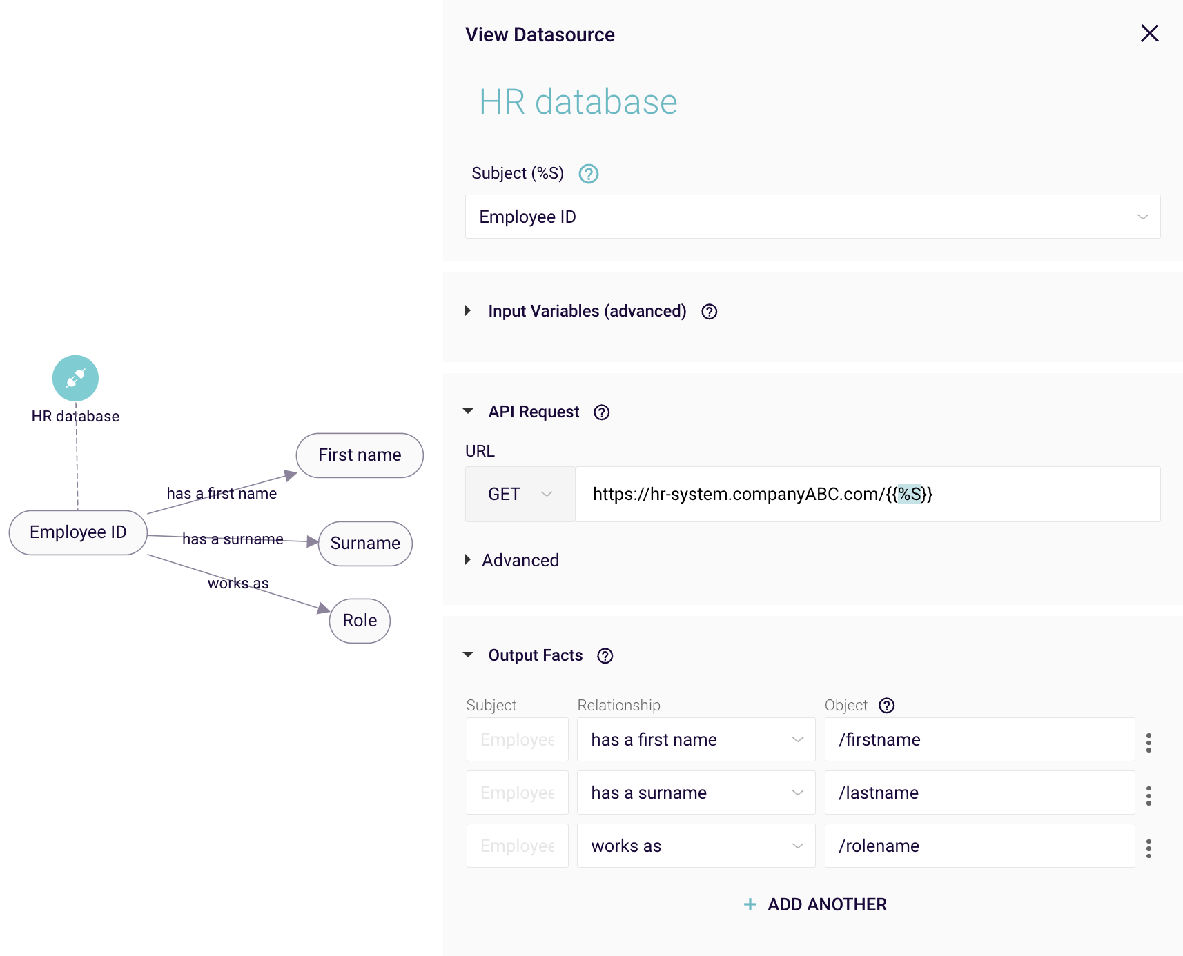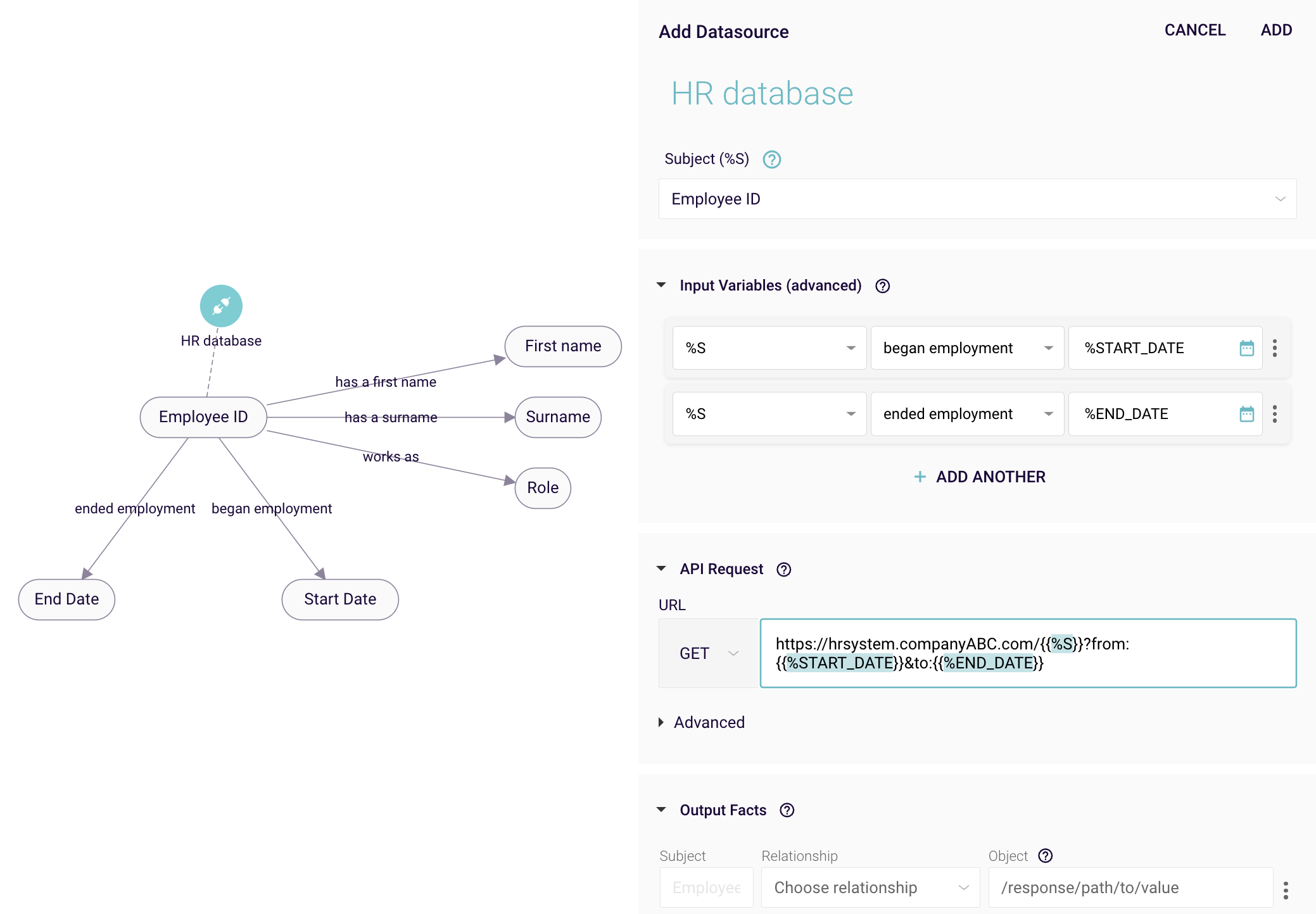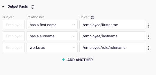 From the Output facts section you can select the relationships you want to create facts for. Facts can only be created for relationships that share the same subject as the datasource, therefore the dropdown will only display applicable relationships. The subject is disabled, as values from the API response can only be applied to the object.