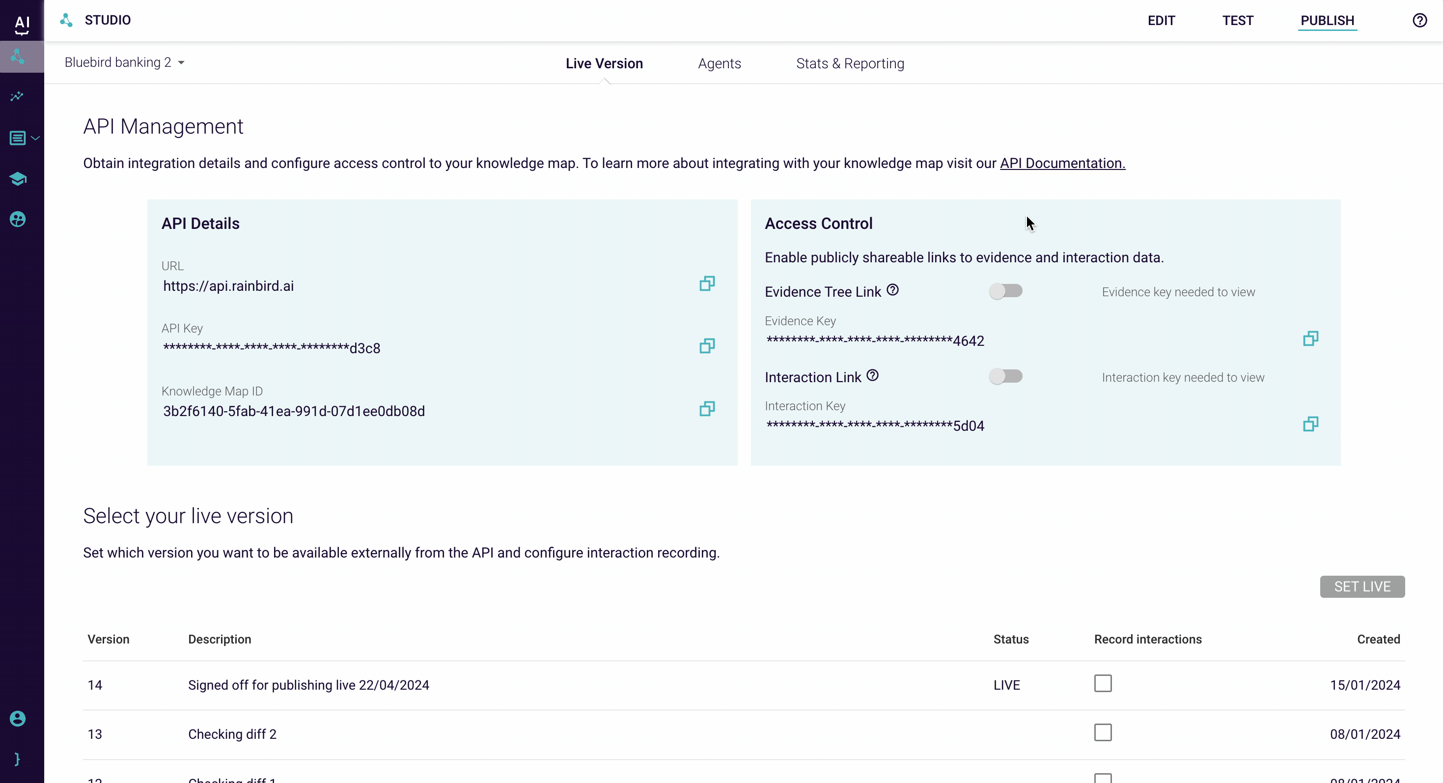 To support integrations into your knowledge map you will need to use the correct URL, KMID and API key for authentication. These can all be obtained in one place. With the knowledge map open, navigate to **Publish** and copy the necessary details.